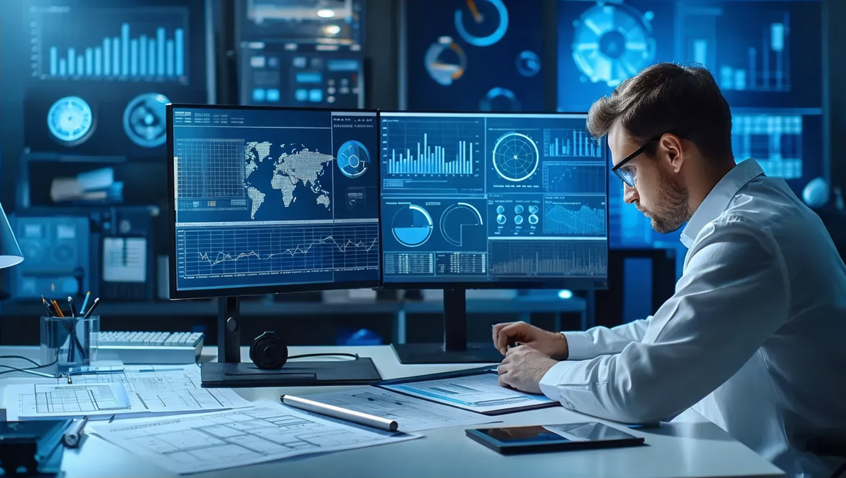 Промпт для изображения: «Инженер за рабочим столом с техническими схемами и чертежами. На мониторе открыт документ с детализированной технической документацией. Рядом лежит планшет с графиками.»